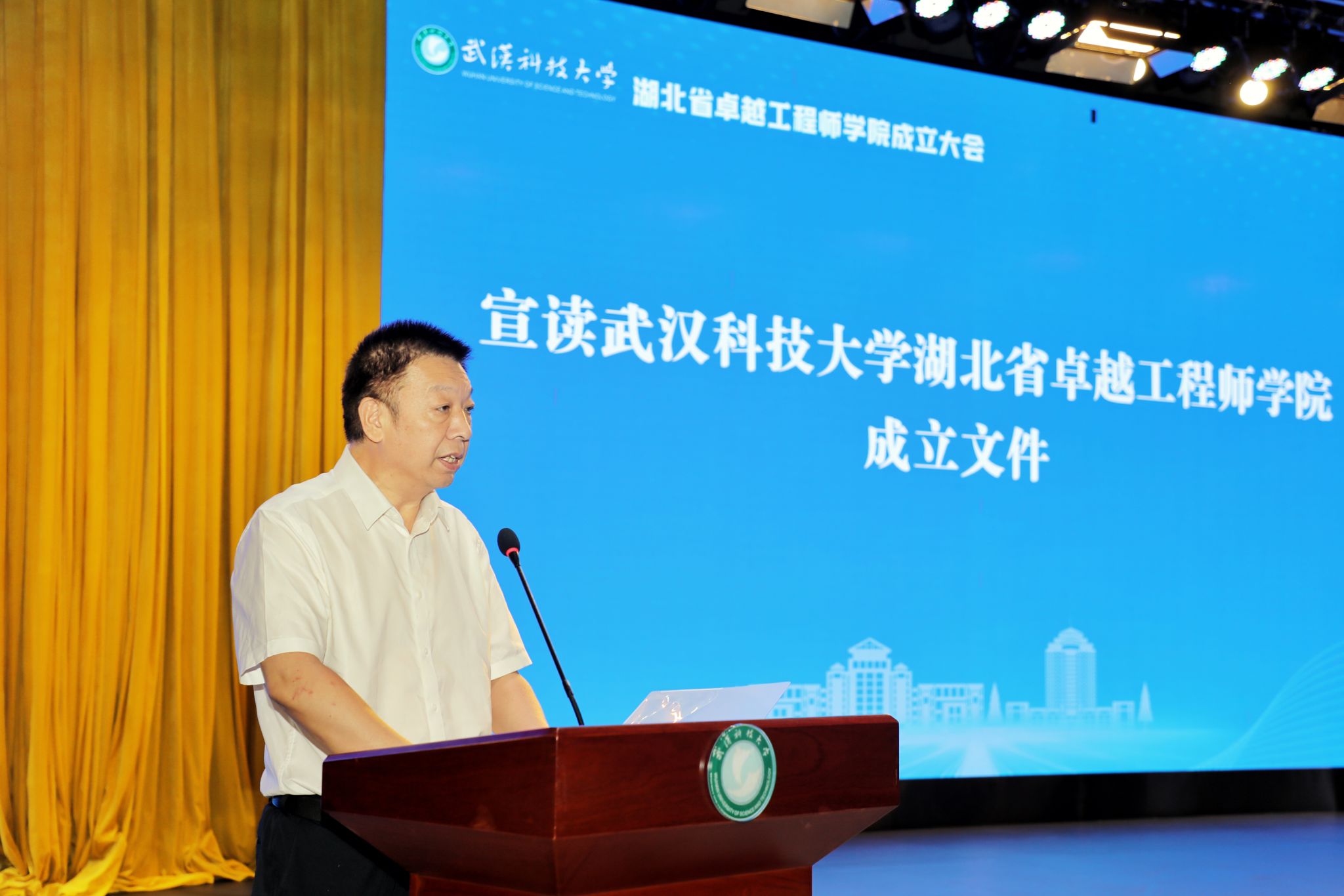 周启红宣读“关于公布首批湖北省卓越工程师学院试点建设高校名单的通知”文件。今年6月,湖北省委组织部、省教育厅、省经信厅、省国资委出台文件,公布了首批湖北省卓越工程师学院试点建设高校。我校与武汉大学、武汉理工大学、湖北工业大学一同入选。