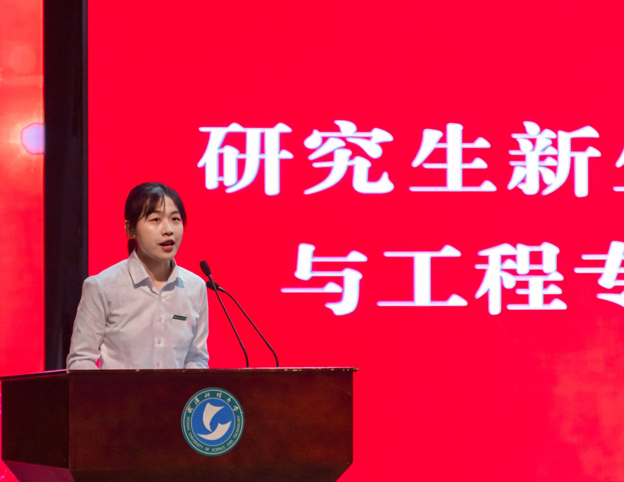 典礼在雄壮的国歌声中拉开序幕。校党委书记徐雁冰为研究生新生代表佩戴校徽,勉励大家传承武科大基因,锤炼武科大品格。