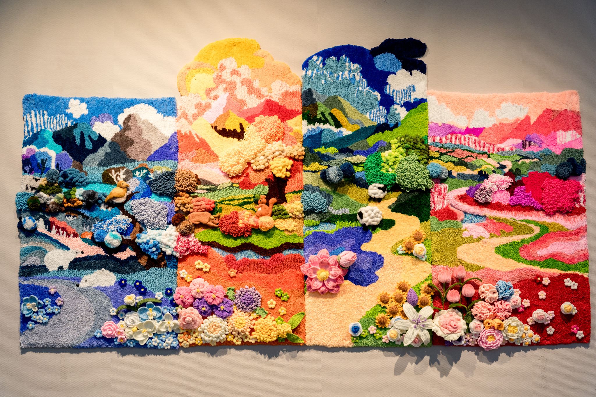 在展览的一角,地面上散落着各种样式、大小不一的圆形花纹,展板上,三条飘带纹样贯穿武汉市黄鹤楼、古琴台、长江大桥等标志性建筑。作者倪子娴介绍道:“这些圆形图案都源自明朝皮球花纹,我在皮球花纹的基础上设计了 32 种花纹,又以数字动画的形式,将花纹与武汉市标志性景点相结合。”