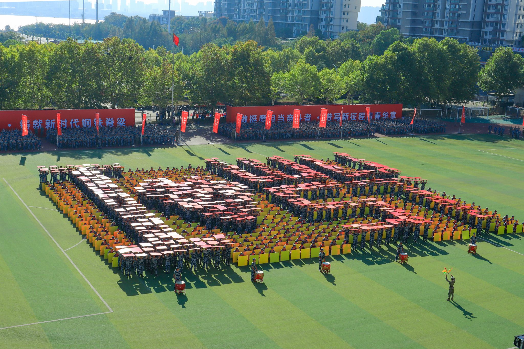 6200 余名本科新生身着迷彩服参加此次活动。大会在庄严雄壮的国歌旋律中拉开序幕。摆字方阵迅速调换红、黄纸板,依次摆出 “WUST”“1949”“中国” 等字样,擒敌拳方阵的拳术动作整齐划一,应急棍方阵接踵而至,匕首操方阵在响亮的 “杀” 声中精彩完成表演,武术表演和战场战术表演结束后赢得了场上阵阵掌声。各学院新生身着迷彩服,高举旗帜,喊着嘹亮的口号,迈着整齐的步伐从主席台前走过。