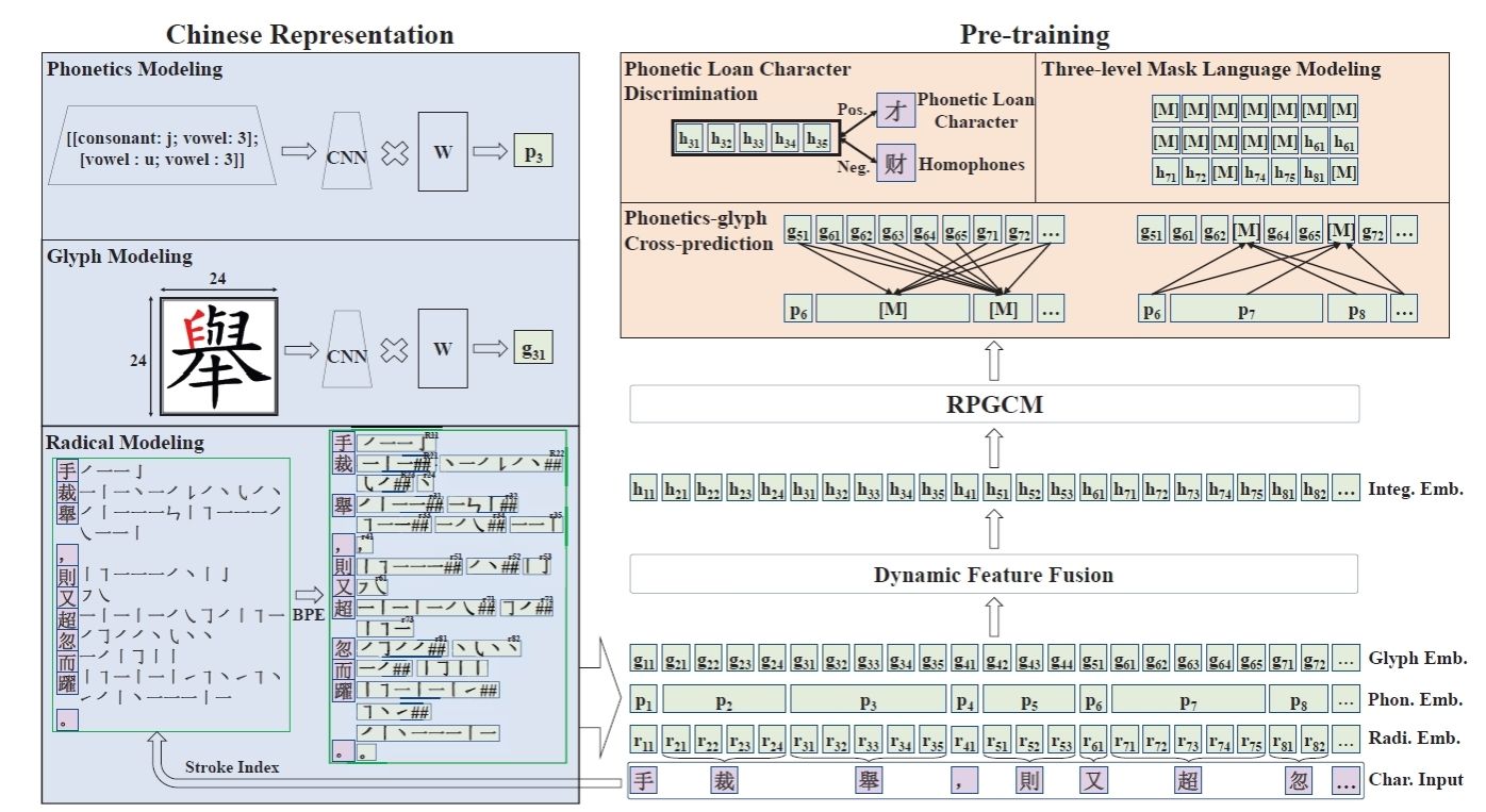 在汉字自身的形、音、义协同机制层面,团队首次将部首级音形表征引入古典中文预训练,提出基于笔画序列BPE子词切分、部首字形ResNet编码与多音字拼音CNN编码的跨模态融合策略,辅以通假字判别、三级掩码语言建模与音形互译三大预训练任务(RPGCN),显著缓解了通假、歧义及低频字误读等问题。在C³Bench、WYWEB等综合理解基准的评测中,该轻量级模型均稳定反超基线系统3至7个百分点,验证了形音义联合建模在小参数条件下的有效性。
