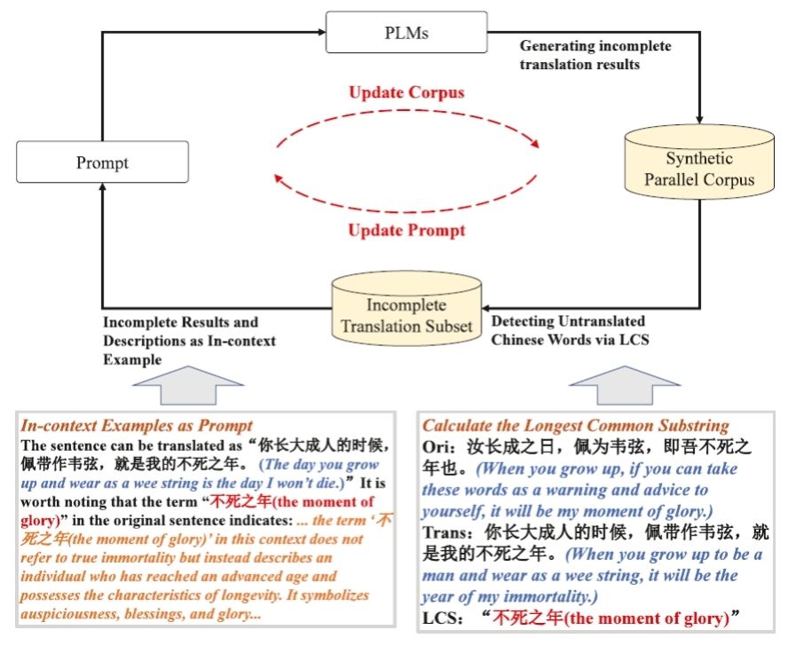 为缓解高质量平行语料稀缺导致的训练瓶颈,团队设计了一套由大语言模型驱动的渐进式译文精炼框架(图2),利用最长公共子串算法自动检测未翻译文言词汇,并通过语义描述示例反复迭代,最终生成规模为37.2 GB、未翻译词比例降至5.8%的高对齐语料库,其构建成本仅相当于传统人工标注的百分之三,却足以支撑小模型的充分训练。